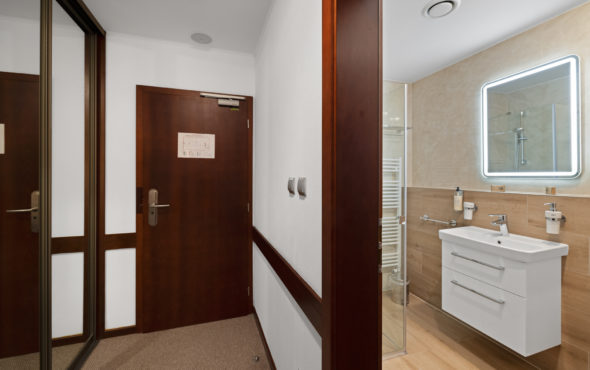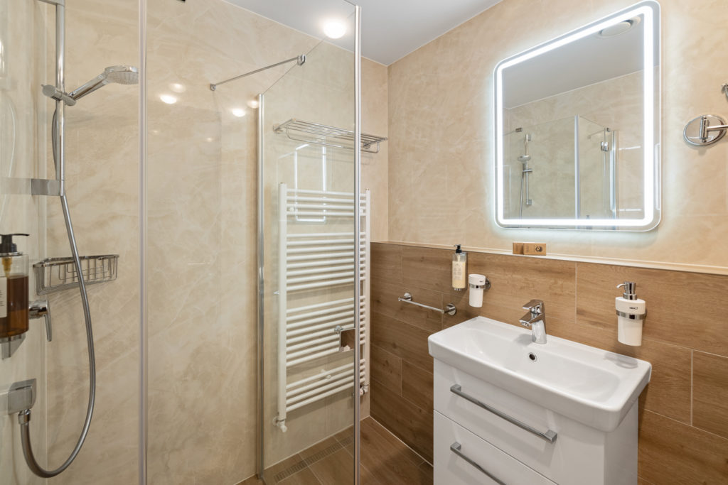- Kúpeľňa so sprchovacím kútom a WC